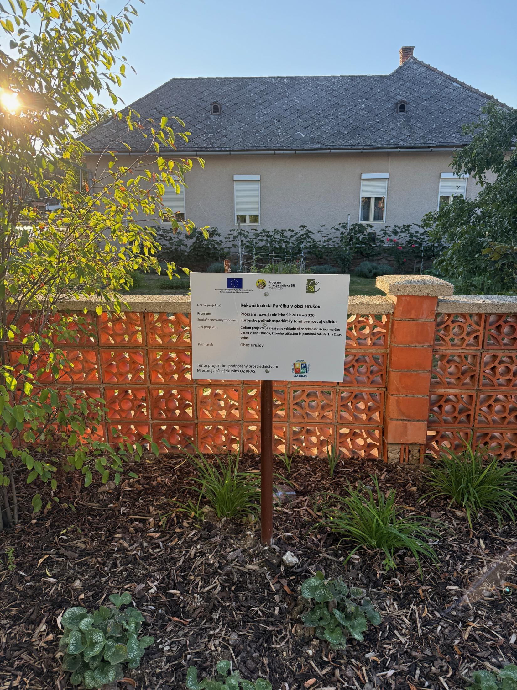 Cieľom projektu je zlepšenie vzhľadu obce rekonštrukciou malého parku v obci Hrušov, ktorého súčasťou je pamätná tabuľa 1. a 2. sv. vojny.